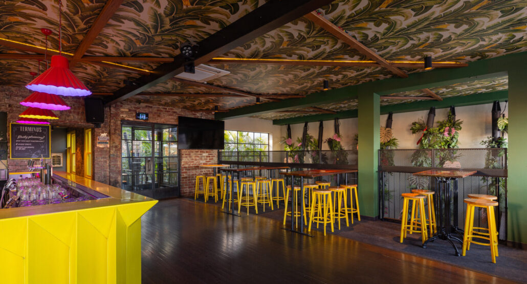 Our Level One bar is reminiscent of a classic roaring 1920’s Parisian watering hole, complete with a banana yellow folded steel bar, lush jungle wallpaper and a dance floor, overlooking the public bar.